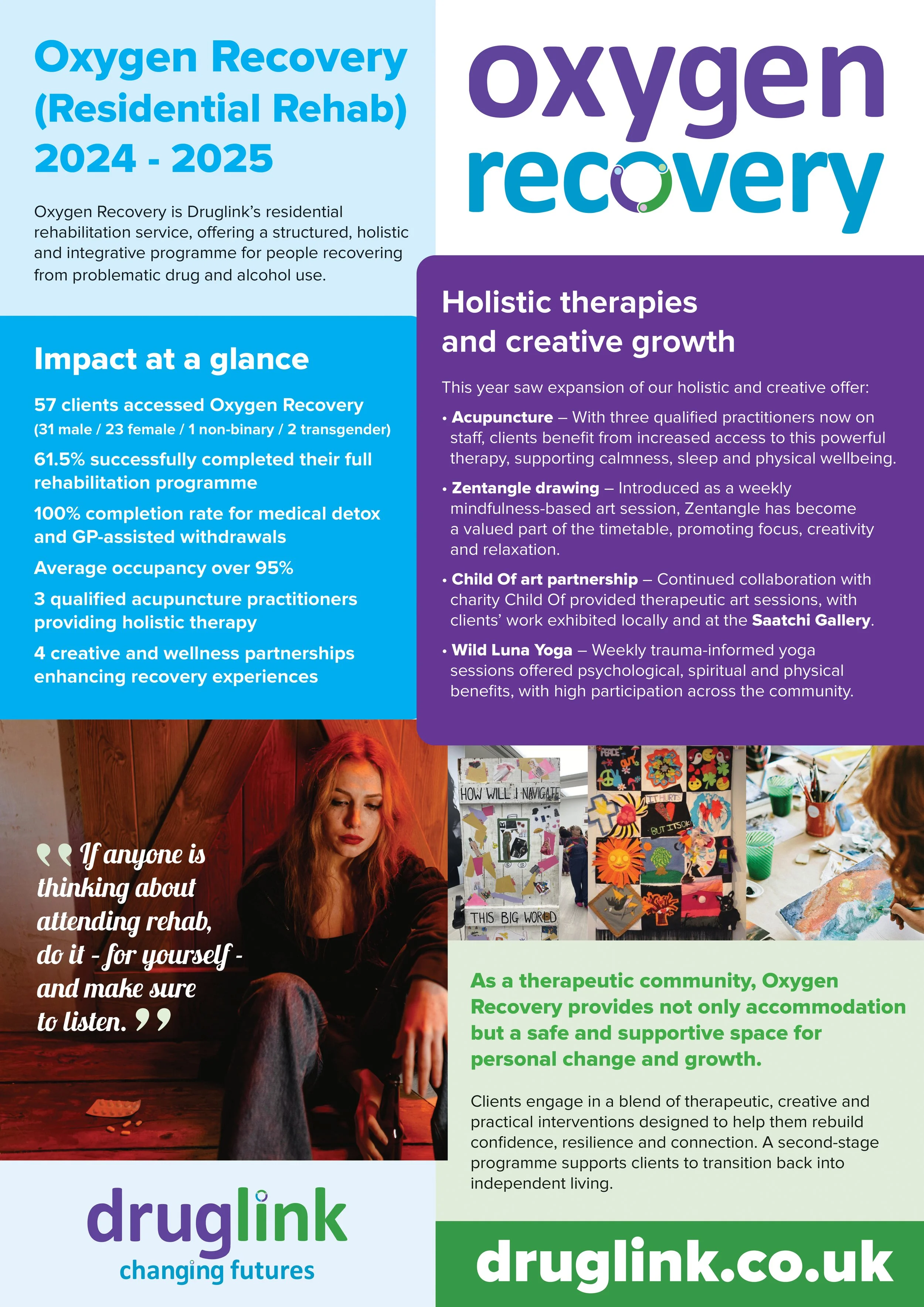 We’re proud to share our Oxygen Recovery Service Report 2024–2025. This year’s report highlights the impact of our residential rehabilitation service, including strong completion rates, holistic therapies, creative partnerships, and the voices of people at the heart of recovery. Take a moment to read the report and see how lives are being supported, rebuilt, and changed for the future.