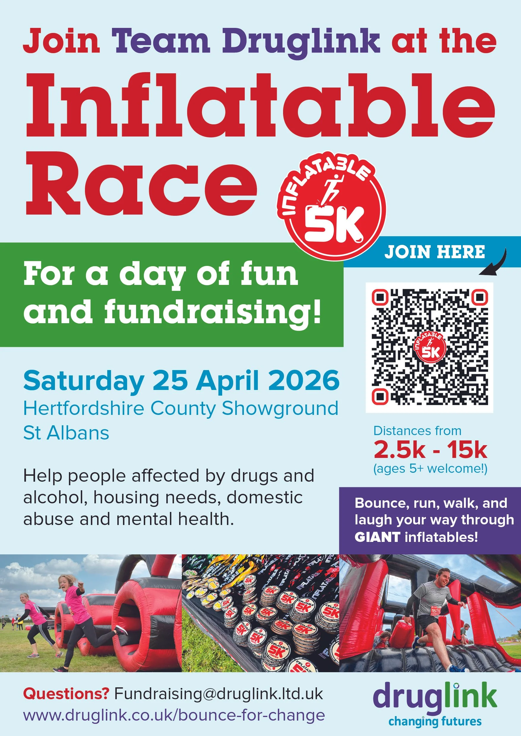 Join Team Druglink at the Inflatable Race for a day of fun and fundraising! Get ready to run, jump, and bounce your way through the UK’s biggest inflatable obstacle course - with over 30 gigantic inflatables and distances from 2.5k to 15k, there’s something for everyone! Whether you’re a runner, walker, or just in it for the laughs, this event is pure joy from start to finish (kids aged 5+ can take part too!). Find out more and sign up here!